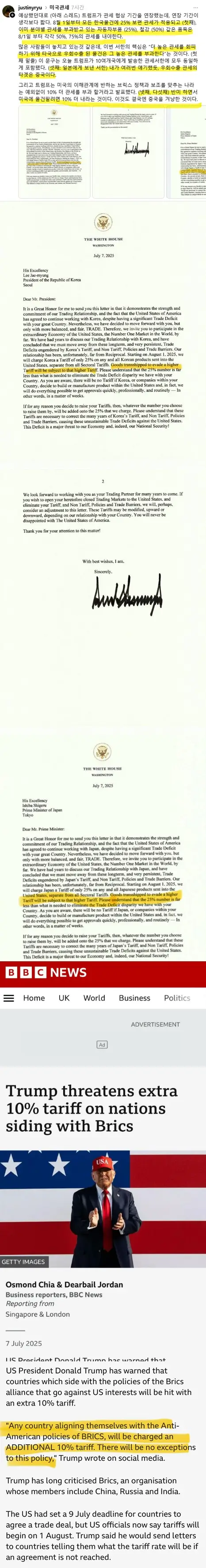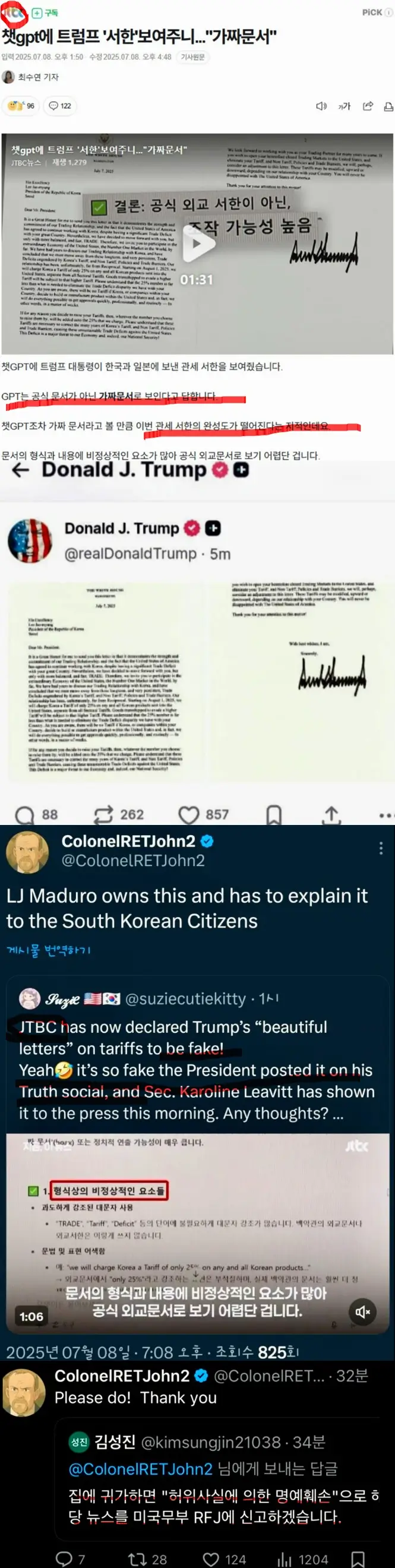 트럼프는 자신의 관세에 대한 정책, 행정명령서한을 의도적으로 자신의 소셜미디에서 게재했습니다. 그러자, JTBC에서는 챗지피티 운운하면서 이 서신이 '가짜문서'라는 이야기라고 기사를 냈는데요. 국내 언론사 참 열일하고 있습니다만, JTBC는 신고당하게 생겼습니다.